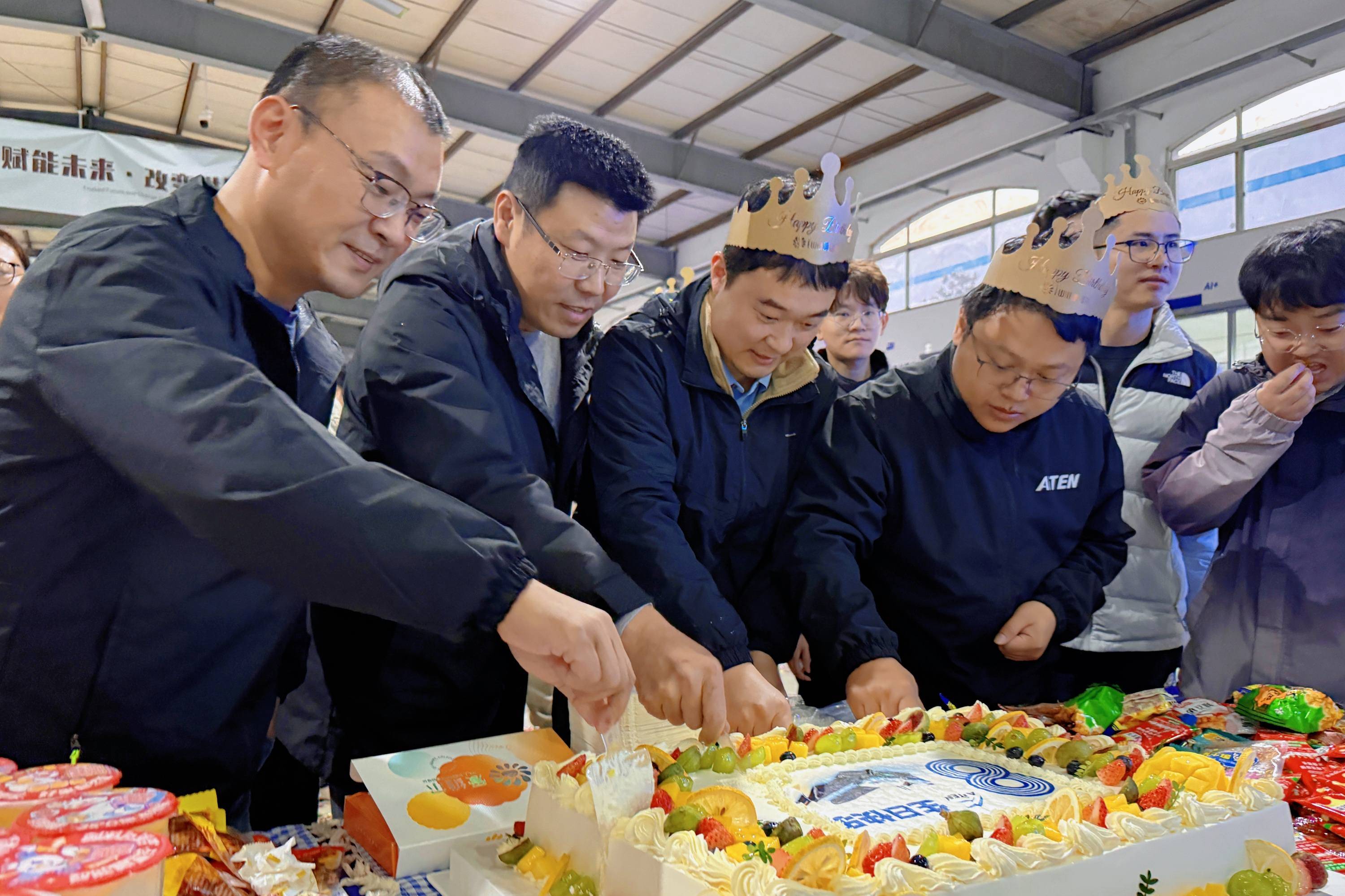 周年会特别为第四季度生日的员工准备了温馨的生日庆祝环节,寿星们一起吹灭蜡烛,许下心愿,接受全公司的祝福。餐台上各色美食渐空,盘子里中西点心混在一起,没有祝酒词,没有正式发言,只有餐具的轻响、随意的走动和此起彼伏的“这个好吃,你尝尝”。