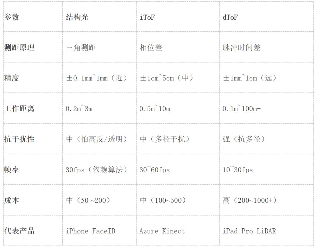 Time-of-Flight(ToF)是三大主流3D成像技术之一(另两种为结构光与双目立体视觉)。其原理是通过发射近红外光并计算光线往返时间,直接获取物体的距离信息(深度)。相较于其他技术,ToF具有计算简单、抗干扰强、远距离测量的优势,因此被广泛应用于手机后置摄像头(如华为/OPPO/苹果)、工业自动化、AGV导航和机器人抓取等领域。